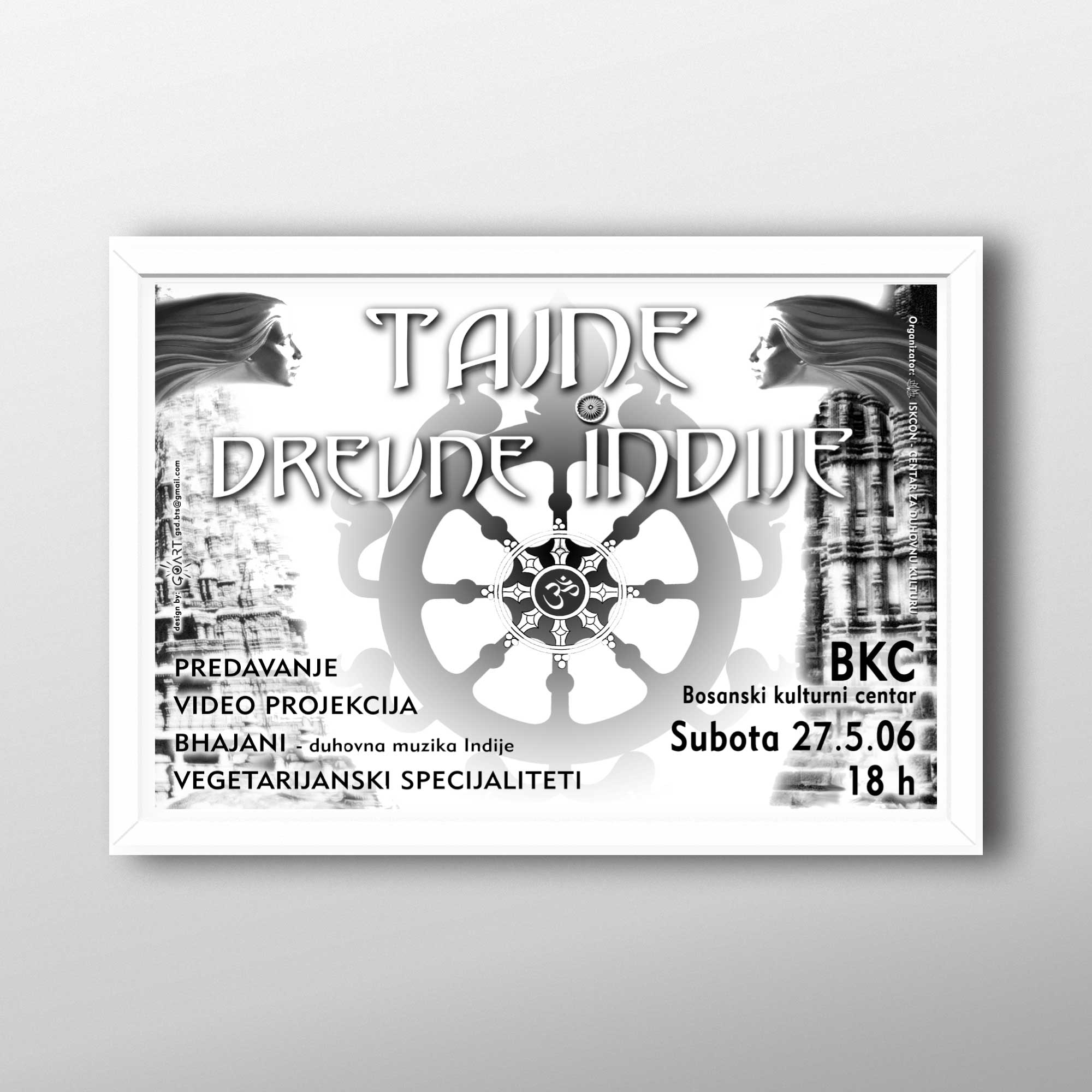 The poster composition is a blend of elements that characterize the ancientness and mystic of India. The foggyness from which the wheel of the samsara (symbolizing the life cycle) represents the mystery of life that is gradually reveals.